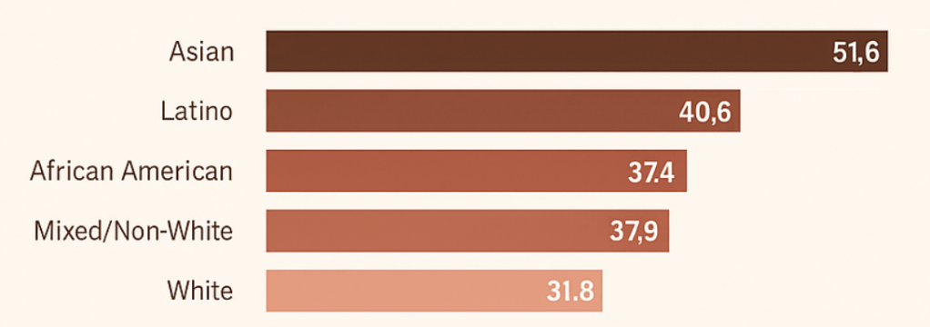 The two majority Asian census tracts in Oakland had the highest average pollution burden (51.6), far higher than the average for majority White census tracts (31.8). Majority African American and majority Latino census tracts also had higher average pollution scores than majority White census tracts (37.4 and 40.6, respectively), as did non-White/mixed census tracts (37.9). The pollution burden score in majority Asian census tracts was 1.63 times higher than the score in majority White census tracts.