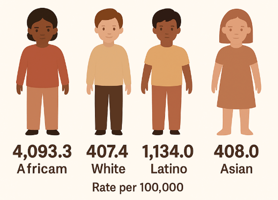 Census Data shows that African American children had much higher rates of asthma-related emergency department visits (4,093.3 per 100,000), compared to White children (407.4 per 100,000). Asian children also had a very low rate (408.0 per 100,000). The rate for Latino children (1,134.0 per 100,000) was also lower than the citywide rate (1,658.0).