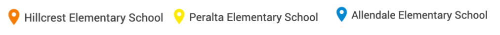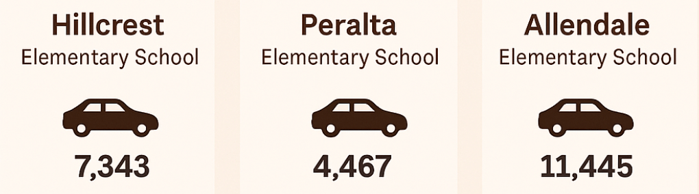Near Allendale Elementary (11,445.32 vehicle-km/hr), traffic volume is highest, followed by Hillcrest (7,343) and Peralta (4,467.52).